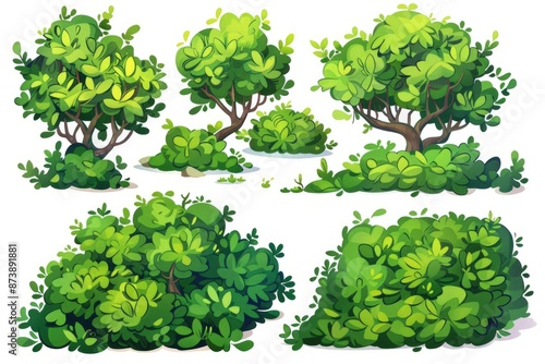 shrubbery, tree, shrub, bush, cartoon, forest, garden, set, green, shape, leaf, natural, design, wood, dirtied, beautiful, grove, illustration, bramble, jungle, coppice, art, object, isolated, element, hedge, nature, painting