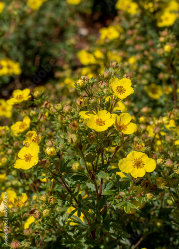 Shrubby cinquefoil yellow flowers in the summer. Blooming Potentilla fruticosa.