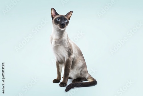 Siamese cat sits on a light blue background looking up and around while showing interest and curiosity in its surroundings