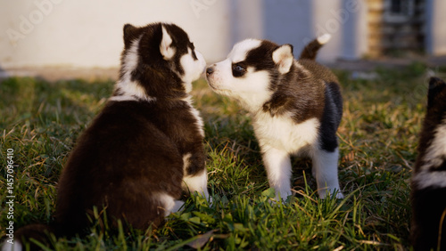 husky, puppy, siberian husky, dog, pet, animal, canino, purebred, playing, cute, adorable, puppy, grass, backyard, outdoors, nature, companion, friendship, black-and-white, breed, pedigree, furry, fluffy, golden hour, sunset, playful, baby animal, sibling, interaction, mammal, puppy, doggy, purebred dog, best friend, sled dog, animal portrait, pair
