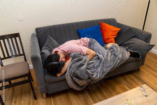 anxiety, blanket, california, computer, couch, cushion, depression, device, electronic, earphones, home, ill, indoor, insomnia, laptop, lifestyle, listening, living room, music, night, disease, sofa, us