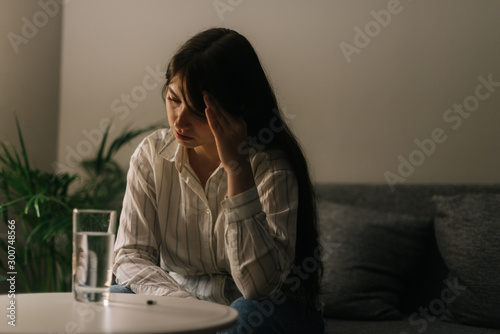 Sick tired beautiful woman sitting in front of a table with a tablet and a glass of water in a dark room.