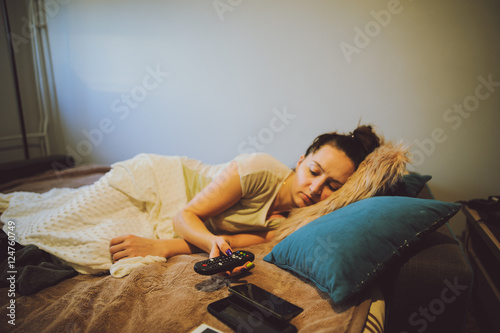 sick, bed, ill, young, health, cephalalgia, pain, lying, woman, flu, unwell, head, white, sleepy, disease, disease, cold, temperature, female, attractive, medicals, adult, pillow, medicine, fever, people, person, sad, bedchamber, caucasian, television, remote, hand