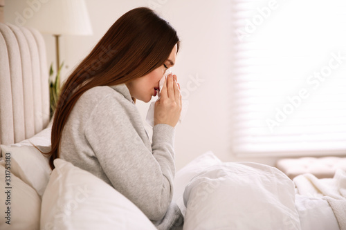 Sick young woman in bed at home. Influenza virus