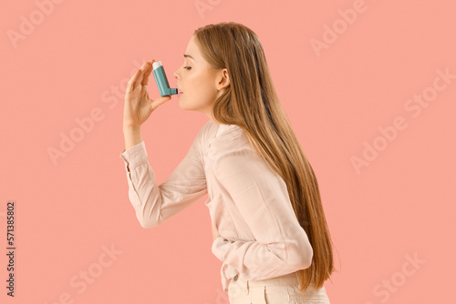 Sick young woman with inhaler on pink background