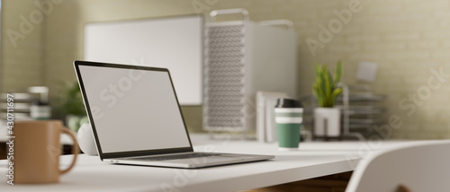 Side view, 3D rendering, portable workspace with laptop and mug on the table with office supplies in the back
