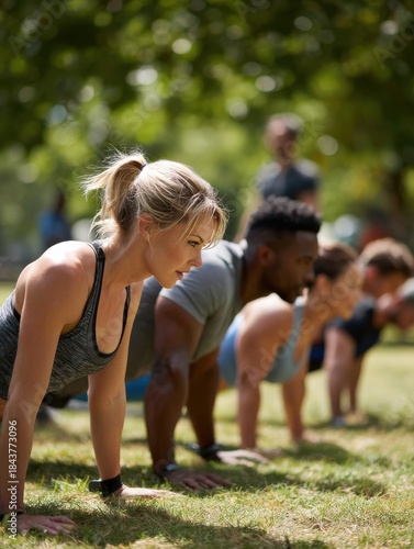 side view of a group of fitness people doing push ups in the park no logos no brands ar 34