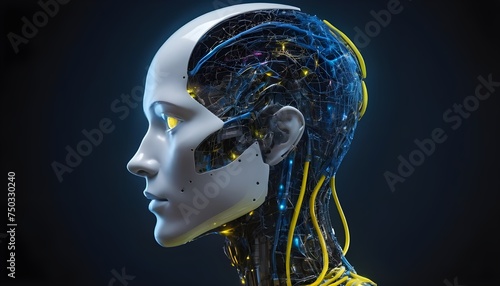 Side view of a humanoid head with blue and yellow eyes and vibrant neon neural network, representing futuristic technology and artificial intelligence
