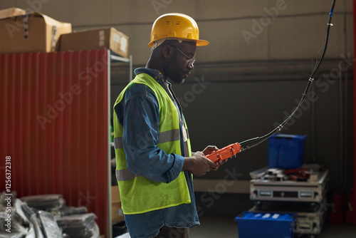 Side view of African American factory worker pressing buttons on control pad while working with industrial equipment in warehouse