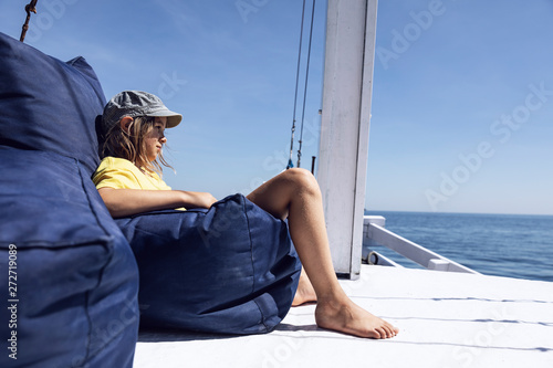 sit, side, ocean, travel, lifestyle, blond, t-shirt, outdoors, day