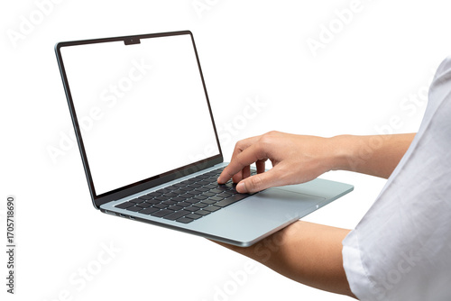 Side view of hands on modern laptop, blank screen. Isolated PNG for technology, business, finance, and advertising presentation.
