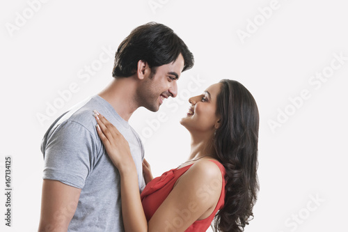 Side view of happy young couple against white background