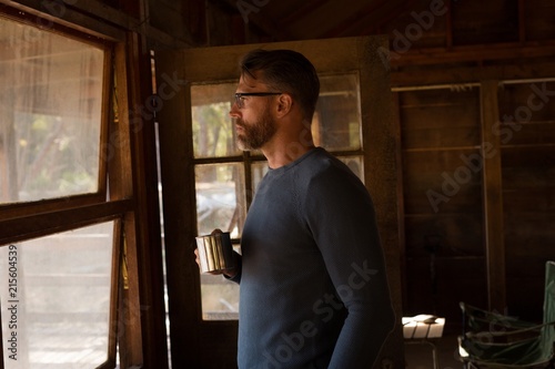 man, mature, adult, caucasian, cabin, log, window, side, look, racked, hold, hot drink, mug, drink, thinks, thoughtful, contemplation, lifestyle, casual attire, eyeglass, beard, waist up, alone, 1, people, indoor, day