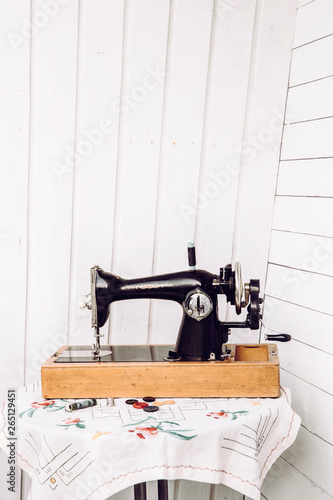 Side view of old cool manual sewing machine hand tool with crank on white wooden board background on table. Vintage arts and crafts concepts.