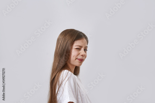 copy space, background, isolated, lifestyle, model, modern, studio, modelling, pose, studio shot, posing, white, isolated on white, white background, emotion, girl, emotional, children, preteen, children, person, female, one person, youngster, caucasian, european, t-shirt, beautiful, wink, cropped, cute, winking, partial, crafty, crafted, tricky, half face