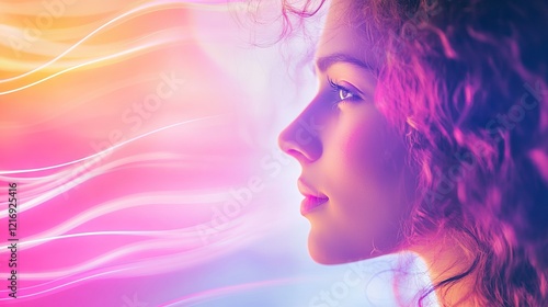 Side View Of Woman Amid Soft Luminous Waves Design