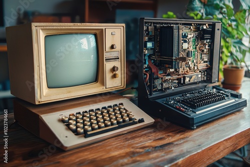tech, evolution, vintage, modern, design, electronic, out-of-date, innovation, comparison, progress, contrast, device, contraption, history, advancement, computing, retro, future, upgrade, educational, transformation, technology, development, old, new, visual, digital, side by side, aesthetic, past, present, growth, revolution, sleek, clean, background, difference