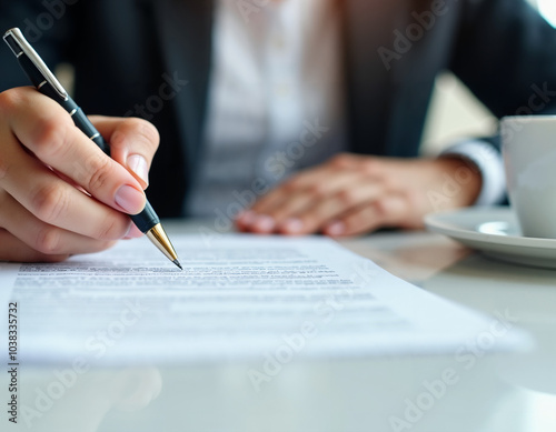 contract, signing, document, pen, hand, business, finance, legal, agreements, paperwork, office, desk, table, lawyer, notary, signature, closeup, detail, professional, businesswoman, businessman, working, white, gold, silver, black, businessperson, paper