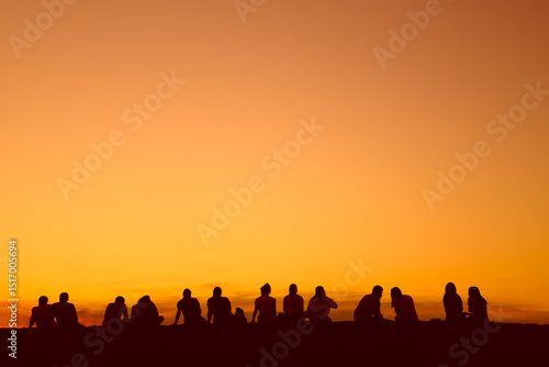 Silhouette back rear view of group happy people friends team sitting together on sunset sky evening time for business success and teamwork concept in company. Kalemegdan fortress.