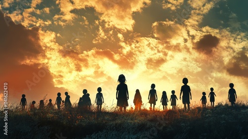 Silhouette back refugee kid group.Responsible.Kid child boy and girl worship.World kids day, Pray and worship, Hope, freedom, Diverse, Faith.World refugee day.Juneteenth kid.Friends.Potential unlock.