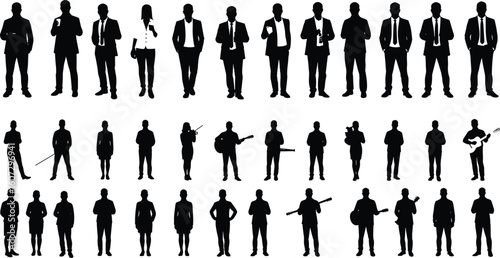 Silhouette collection of business people, musicians, various poses, instruments, standing and performing, isolated black vector figures on white background