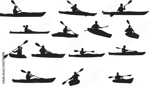 Silhouette collection of people kayaking in different positions, kayaking vector set, outdoor water sport concept, paddle kayak illustration