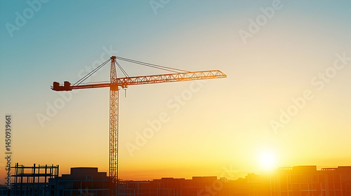 construction, crane, sunset, silhouette, building, city, sunrise, pixelated, graphic, digital, design, industrial, architecture, urban, horizon, sky, orange, yellow, blue, gold, light, construction site, evening, morning, outdoors, panorama, landscape, metal, steel