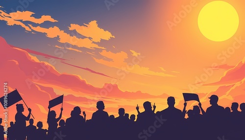 impact, oneness, gathering, justice, political, right, voice, hope, strength, belief, equality, fight, movement, public, community, crowd, change, future, social, opinion, message, solidarity, struggle, silhouette, together, event, freedom, power, action, flag, cause, ideal, revolution, people, rally, protest, demonstration, march, sun, sunset, sky, banner, activism, manifestation