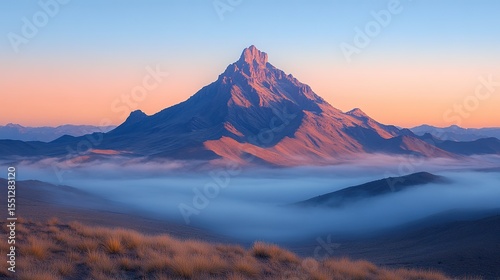 Silhouette Distant Mountain Peak at Dusk with Haze and Warm Glow for Travel and Meditation Background