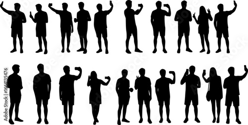 Silhouette group of people selfie different poses silhouette vector set on white background.