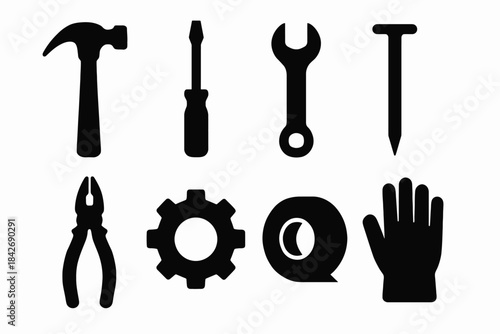 silhouette, icon, hand, tool, gear, hammer, screwdriver, wrench, plier, nail, speech, bubble, glove, hardware, repair, bricolage, construction, maintenance, black, white, safety, set, mechanic, labor, equipment, instrument, industrial, utility, service, symbol, design, aid, icon, vector