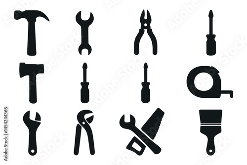 tool, icon, silhouette, hand, hammer, wrench, screwdriver, plier, saw, tape, measure, spanner, adjustable, brush, construction, equipment, instrument, hardware, repair, mechanic, black, isolated, set, carpenter, engineering, maintenance, metal, paint, work, industrial, illustration, vector, design, no people, screw, icon, symbol, collection