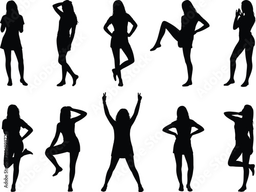 Silhouette illustration of young woman in different fashion poses, standing, sitting, dancing, lifestyle activity concept, black vector isolated design, modern art