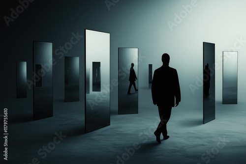 Silhouette Man Walking Mirrors Reflective Corridor Introspection Modern Gray Abstract Path Identity Choices Journey