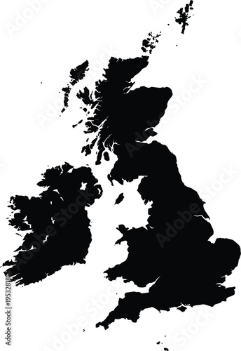 Silhouette map of United Kingdom, detailed geographic outline of UK islands, England Scotland Wales Northern Ireland, black and white vector illustration