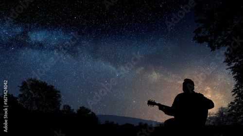 person, silhouette, night, sky, star, milky way, guitar, playing, music, tree, nature, outdoors, dark, astronomy, landscape, night sky, musical instrument, night photography, copy space, calm, peaceful, creative, freedom, music lover, musician, night time, galaxy, evening, travel, photo