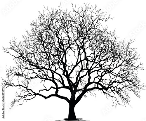 Silhouette of a bare tree with intricate branches, black on white, minimalistic art. Vector illustration