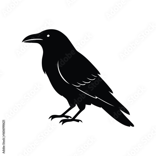 crow, raven, bird, silhouette, black, white, background, perched, avian, wildlife, animal, nature, symbol, gothic, dark, minimalist, vector, illustration, drawing, icon, graphic, creature, feathered, wing, beak, leg, standing, profile, side, view