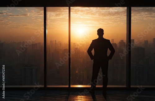 Silhouette of a businessman gazing at a sunrise city skyline through large windows