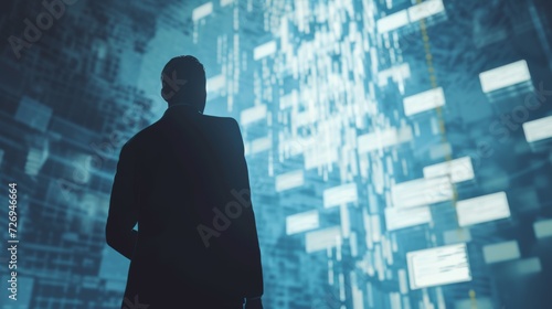 Silhouette of a businessman in an office against a data background. Investment business and leadership concept