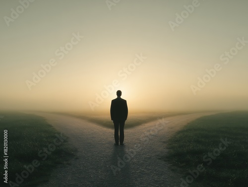 man, road, choice, way, direction, crossroad, businessman, fork, silhouette, career, decision, future, success, leadership, strategy, path, travel, sunrise, morning, fog, field, landscape, outdoors, suit, adult, male, person, executive, corporate, manager, leader, employment, journey, opportunity, destination, growth, challenge, vision, alone, standing, forward, planning, exploration, route, uncertainty