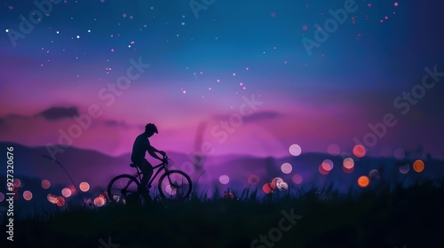 silhouette, bicyclist, bike, cycling, sunset, dusk, evening, twilight, field, grass, nature, landscape, sky, mountain, horizon, outdoors, activity, adventure, freedom, sport, exercise, travel, road, rural, calm, peace, serenity, light, bokeh, colours, purple, pink, blue, dark, night, star, beautiful, scenic, background