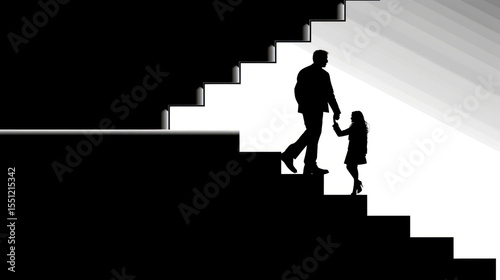 father, daughter, silhouette, staircase, hand in hand, family, love, bond, human relationships, childhood, parenting, support, journey, togetherness, shadow, light, stair, connection, emotion, upward, growth, harmony, innocence, trust, strength, guiding, walking, vertical, minimalist, black-and-white, people, adult, children