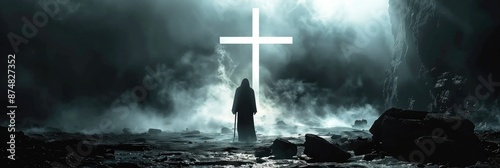 cross, figure, silhouette, mist, fog, dark, gloomy, light, heaven, god, religion, belief, spiritual, faith, holy, divine, mystery, hope, salvation, christianity, catholic, religious, fantasy, dramatic, art, concept, inspiration, gothic, shadow, symbol, cave, rocky, path, sky, ground, landscape, black, white, grey, monochrome, photo, digital