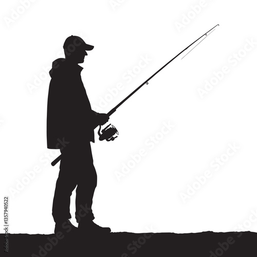silhouette, fisherman, fishing, rod, black, white, angler, casting, standing, hat, sport, hobby, activity, nature, recreation, male, person, shadow, pole, serene, peaceful, calm, graphic, design, artistic, simple, clean, minimalist, monochrome, isolated, landscape, tranquil, fish, equipment, human, lifestyle, simplicity