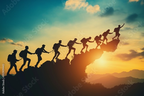 Silhouette of a group of people climbing a mountain, working together, with a beautiful sunset in the background.