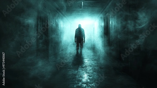hallway, silhouette, hooded, figure, smoke, fog, dark, mysterious, creepy, eerie, light, end, unseen, bright, shadow, unknown, ghost, spirit, abandoned, empty, forgotten, fear, scarey, horror, suspense, danger
