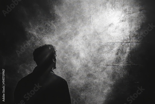 Silhouette of a male figure against a textured, illuminated background, creating a dramatic and contemplative mood.
