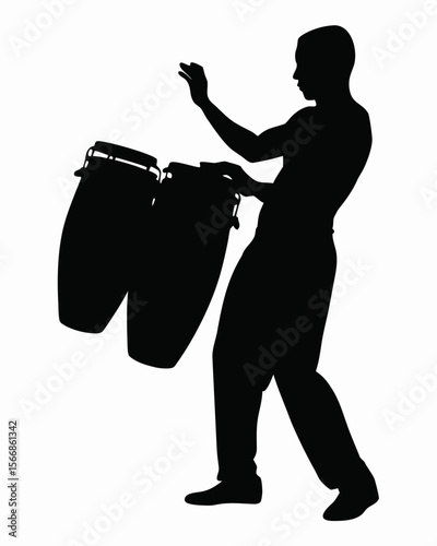 silhouette, man, conga, drum, music, performance, musician, rythm, percussion, instrument, player, hand, raised, stage, art, culture, entertainment, band, latin, african, american, cuban, salsa, dance, studio, isolated, white, background, black, shape, outline, figure, body, arm, leg, foot, shoe, pant, shirtless, male, adult, young, style, design, graphic, vector, illustration, clip art, artistic