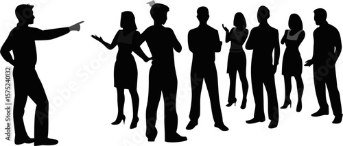 Silhouette of a man pointing at a group of people standing together on a white background scene style